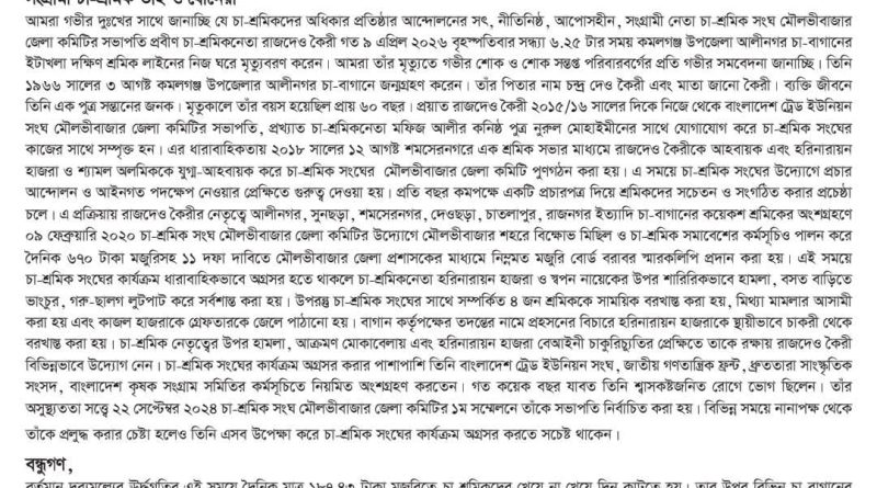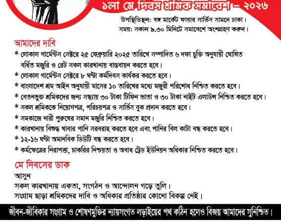 Read Moreপ্রেস বিজ্ঞপ্তি তাঃ ০৫/০৪/২০২৬ কেরানীগঞ্জে গ্যাস লাইট কারখানায় অগ্নিকান্ড অগ্নিদগ্ধ হয়ে ৬ জন শ্রমিকের মৃত্যুতে ট্রেড ইউনিয়ন সংঘের ক্ষোভ, নিন্দা