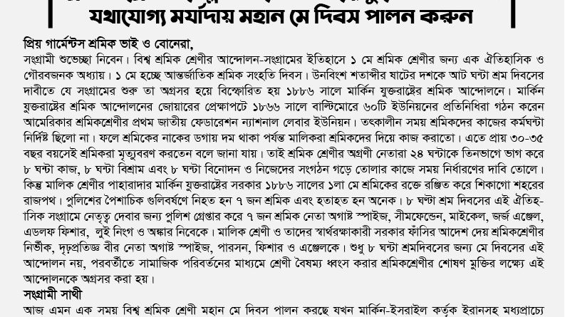 Read Moreঈদুল আযহা উপলক্ষে মাসিক মজুরির সমপরিমান উৎসব বোনাস প্রদান এবং বকেয়া মজুরি অবিলম্বে পরিশোধের আহবান জানিয়ে দেশব্যাপী শ্রমিক সমাবেশ করেছে
