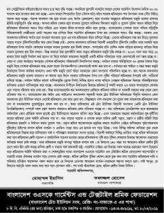 ১৪১ তম মহান মে দিবসে বাংলাদেশ ওএসকে গার্মেন্টস এন্ড টেক্সটাইল শ্রমিক ফেডারেশনের লিফলেট